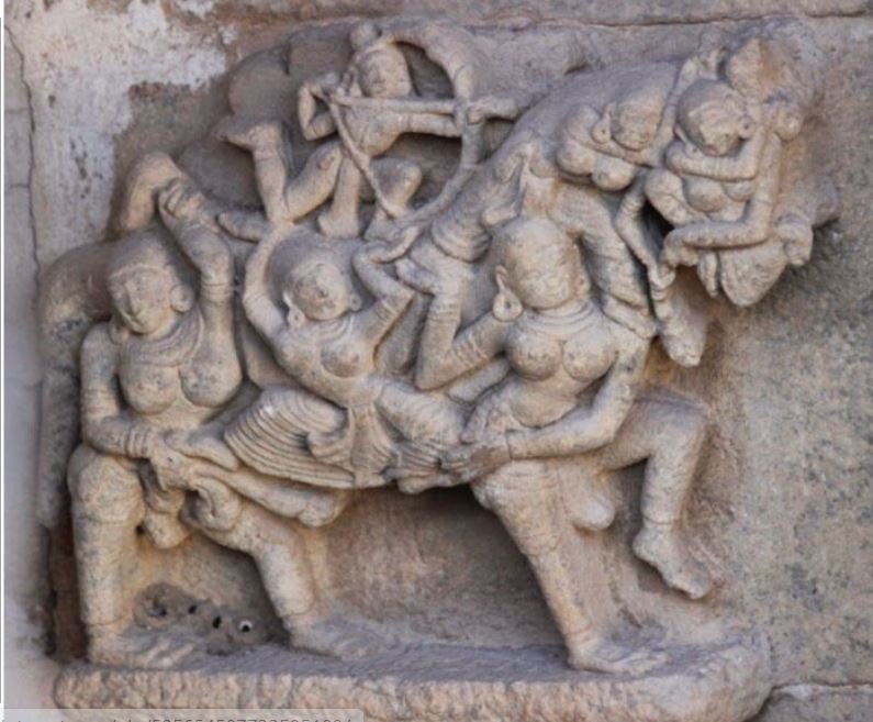 एक ही मूर्ती में दो अलग तरह के दृश्य बनाये गए हैं लेकिन दोनों एक दुसरे के हिस्से हैं यह मंदिर की एक दिवार पर औरतों से बनी हाथी की आकृति की सुन्दर शिल्पकारी है जिसे दूर से देखने पर हाथी प्रतीत होता है पर ध्यान से देखे तो हाथी का हर अंग शिल्पकार ने औरत कीआकृति से बनाया है हाथी के एक एक पैर दो पैरों को मिला कर बनाए हैं पूँछ एक पैर से सूंढ़ भी दो पैरों को मिला कर बनाई है यहाँ तक की दांत भी एक बैठी मुद्रा में औरत के पैरों से ही बनाए गए हैं।ये सब बारीकियां शिल्पकारी ने सिर्फ एक फुट की छोटी सी मूर्ती में की है।