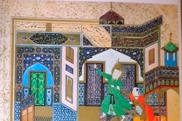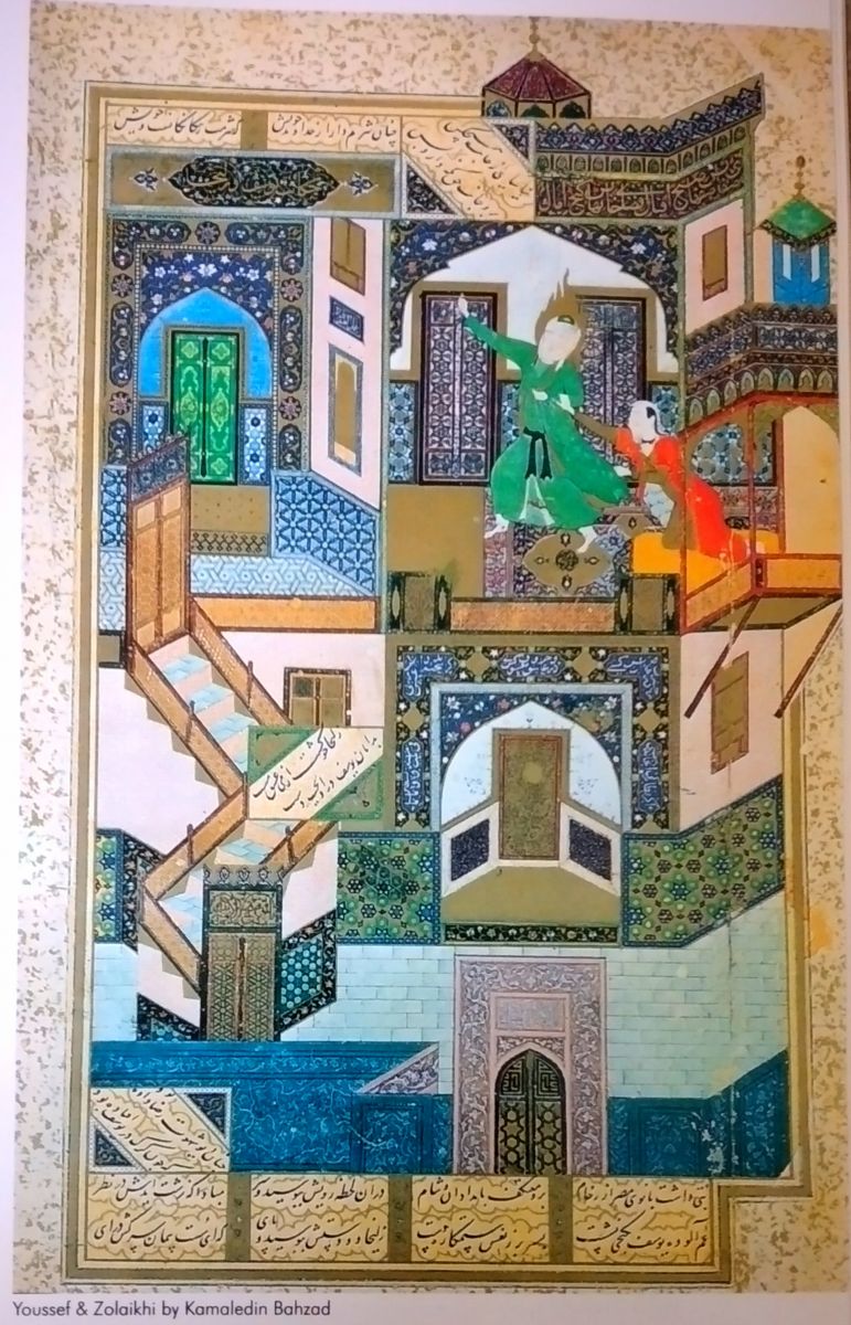 The miniature of Yusuf and Zulekha was created by Kamaledin Bahzad for Bustan of Saadi. this painting shows the most important part of the story in which Zulekha on the recommendation of her maid, orders the construction of a ladyrinth building and sets a trap for her husband "Yusuf".The miniature depicts the "seventh residence" where Zulekha is in pursuit of Yusuf, who in turn is trying to evade her. Zulekha, who is enchanted by the ecstasy of love and is struggling to grasp Yusuf's robe, is the only element in the miniature, wh is dressed in a cadmium yellow bed. She is completely distinct from the rest of the elements. These two colours are not used in any other part of the painting. Yusuf completely wearing green colour with a sacred gilt haloe around his head. According to the story by Jami, despite of the fact that Zulekha had locked all the seven residences, Yusuf miraculously managed to unlock all of the them and escape from Zulekha's temptation. zulekha had got all of the intricate building decorated with potraits of her own and Yusuf in order to seduce him, yet the building depicted in the miniature does not have any air of sensuality about it and on the contrary as a result of skillful composition of colours, it suggests a somber and sublime atmosphere.